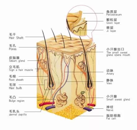 头发是头皮的附属物,也是头皮的重要组成部分。头发的纵向切面从下向上可分为毛*、毛囊、毛根和毛干四个部分。头发露在皮肤外面的部分称为毛干,埋在皮肤里面的部分称为毛根,毛根下端略微膨大的部分称为毛囊,毛囊下端内凹入部分称为毛*。在毛*中有来自真皮组织的神经末梢、血管和结缔组织,为头发的生长提供营养。 头发从外到里可分为毛表皮、毛皮质、毛髓质三个部分:毛表皮可以保护头发不受外界环境的影响,保持头发乌黑、亮泽和柔韧;毛皮质是头发的主要组成部分,几乎占头发的85%~90%,细胞中含有的麦拉宁黑色素是决定头发颜色的关键,同时,皮质纤维的多少也决定了头发的粗细;毛髓质位于头发的中心,它担负的任务就是保护头部,防止日光直接照射进来,较硬的头发含有的髓质也多,汗毛和新生儿的头发往往没有髓质。