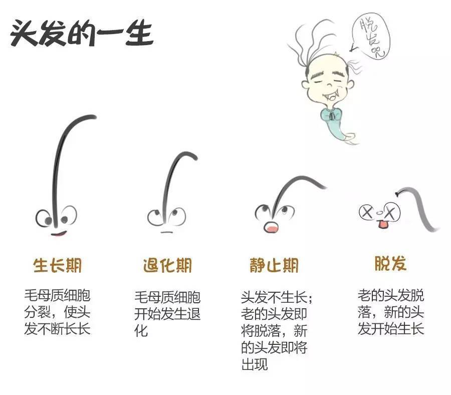 头发也有寿命,并不会源源不断地生长下去,到了一定的时期,它就会停止生长、脱落,然后再有新的毛发诞生,如此循环往复,这就是头发的生长周期。头发的生长周期分为生长期、退化期、休止期三个阶段。通常男性头发的“寿命”为2~4年,女性为3~6,最长可达7年。