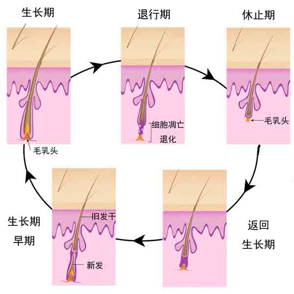 一般来说,头发的生长周期分为生长期、退行期、休止期三个阶段:生长期,毛囊和毛发活跃生长;退化期,头发停止生长,毛囊和毛球发生退化;静止期,毛囊和毛球萎缩,毛发易于脱落。人的头发一般生长期可长达3-10年,退行期2-3周,静止期3-4个月。健康的青年人至少有85%的头发处于生长期。