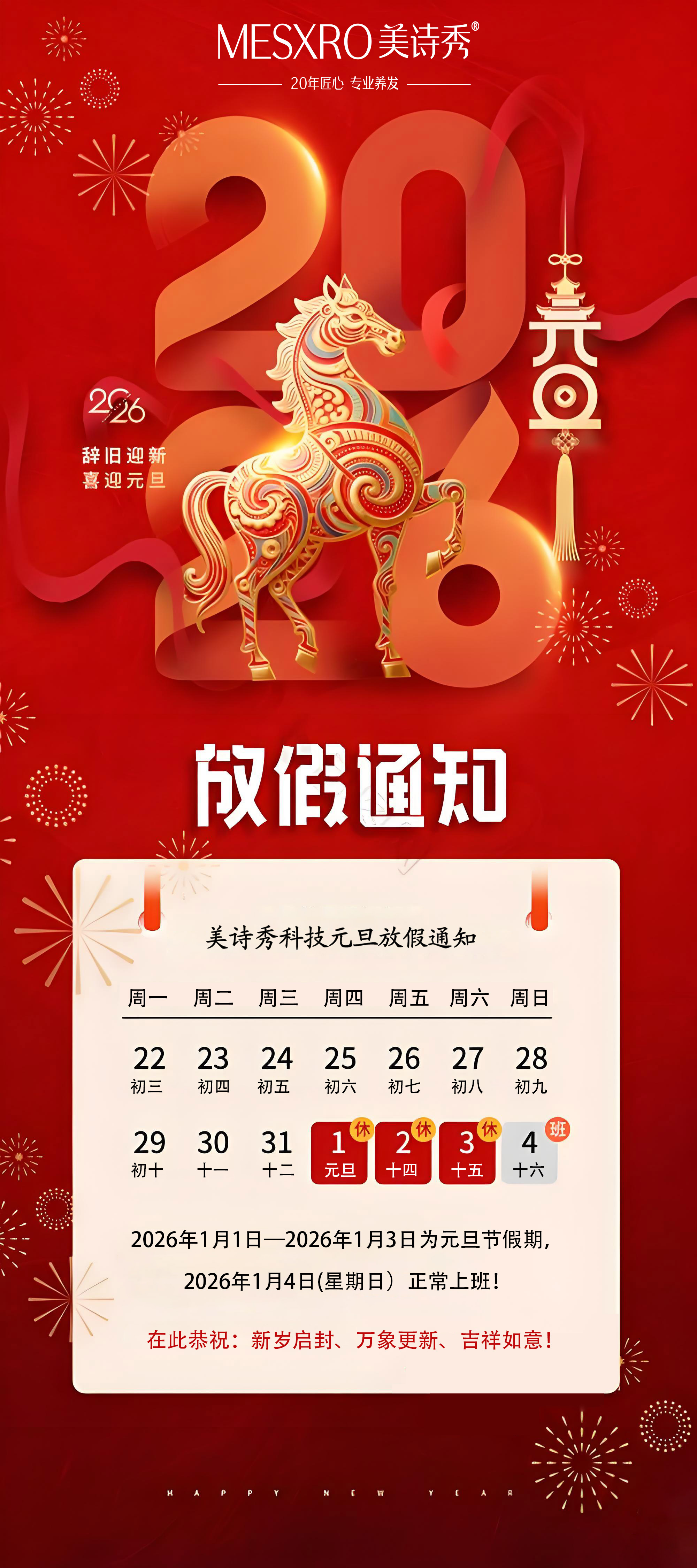 您们好!由于2026年元旦节即将到来,为了使您尽早的了解深圳市美诗秀科技有限公司,元旦节假期的工作安排,现将元旦节假期安排告知如下: