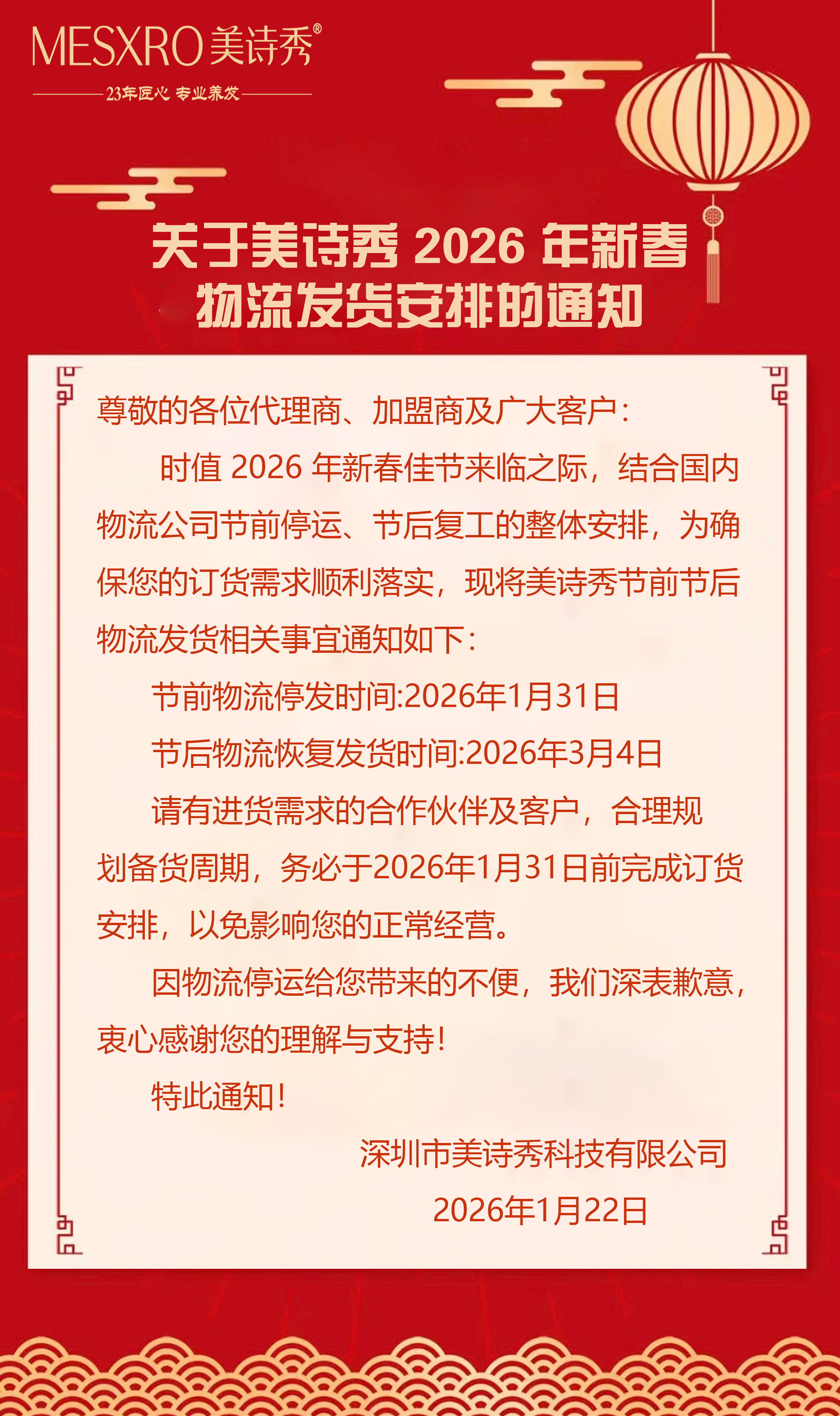 时值 2026 年新春佳节来临之际,结合国内物流公司节前停运、节后复工的整体安排,为确保您的订货需求顺利落实,现将美诗秀节前节后物流发货相关事宜通知如下: